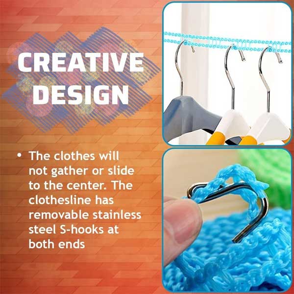 Our clothesline is made of PA. It is thicker and firmer, with better toughness and stronger carrying capacity. Stainless steel hooks are resistant to corrosion and rust and are durable.